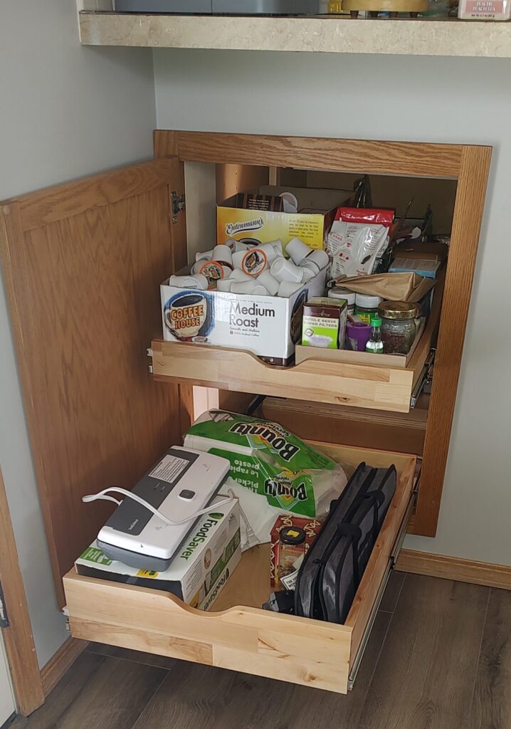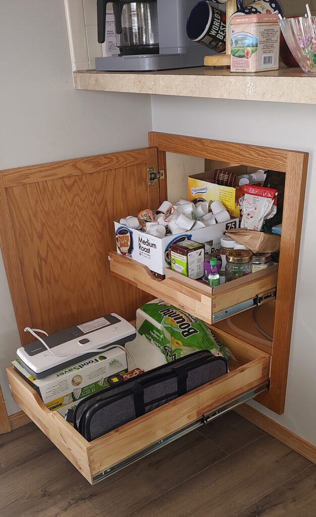 By adding a custom door and installing slide out shelving, they transformed a completely unusable blind corner into a dedicated coffee bar station.