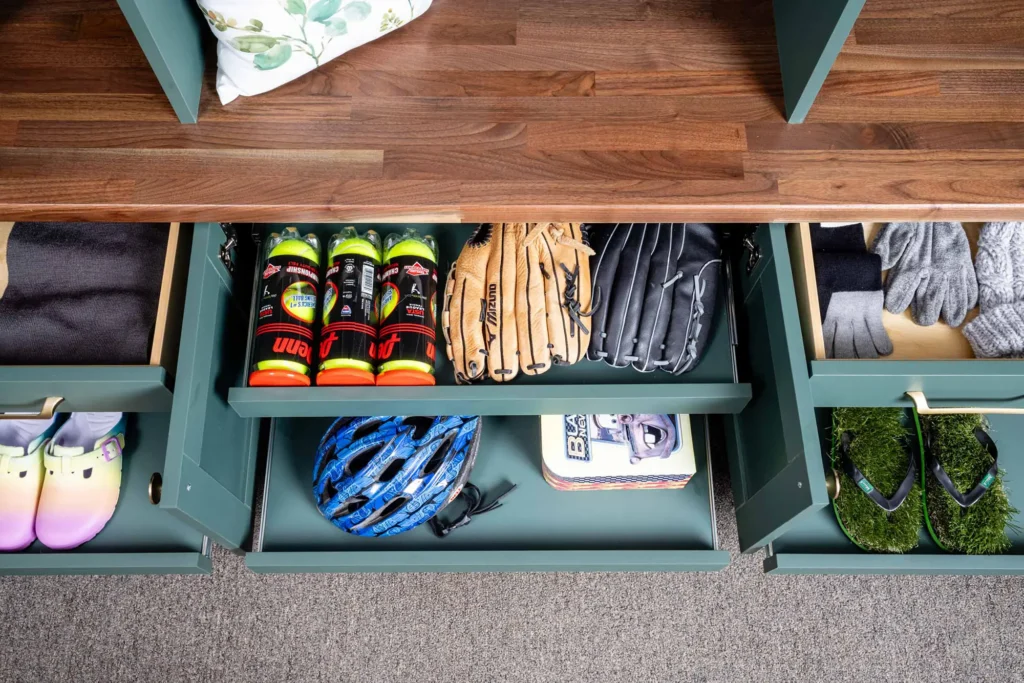 Adding pull out shelves inside mudroom cabinets or bench units allows you to:
